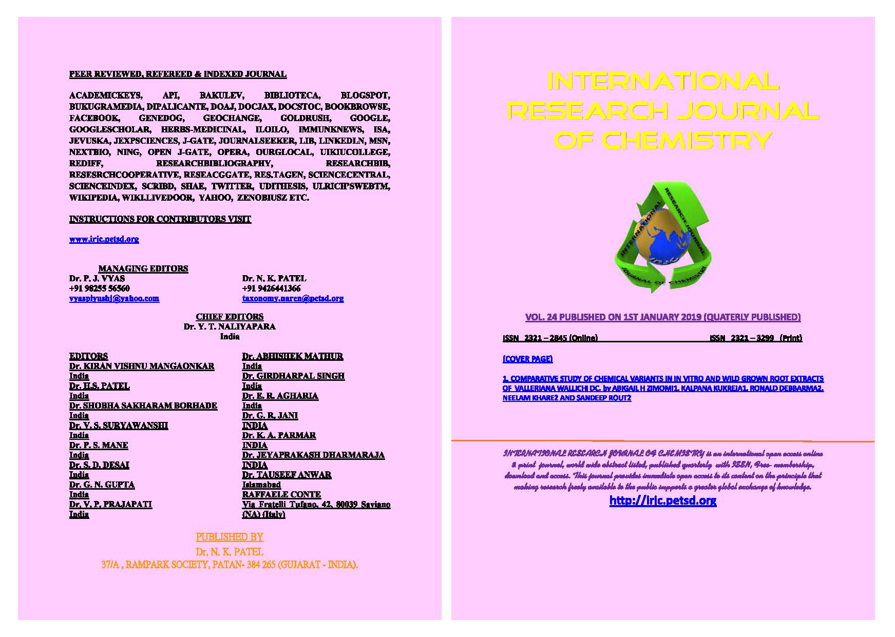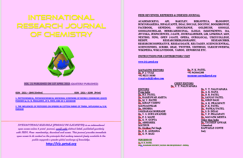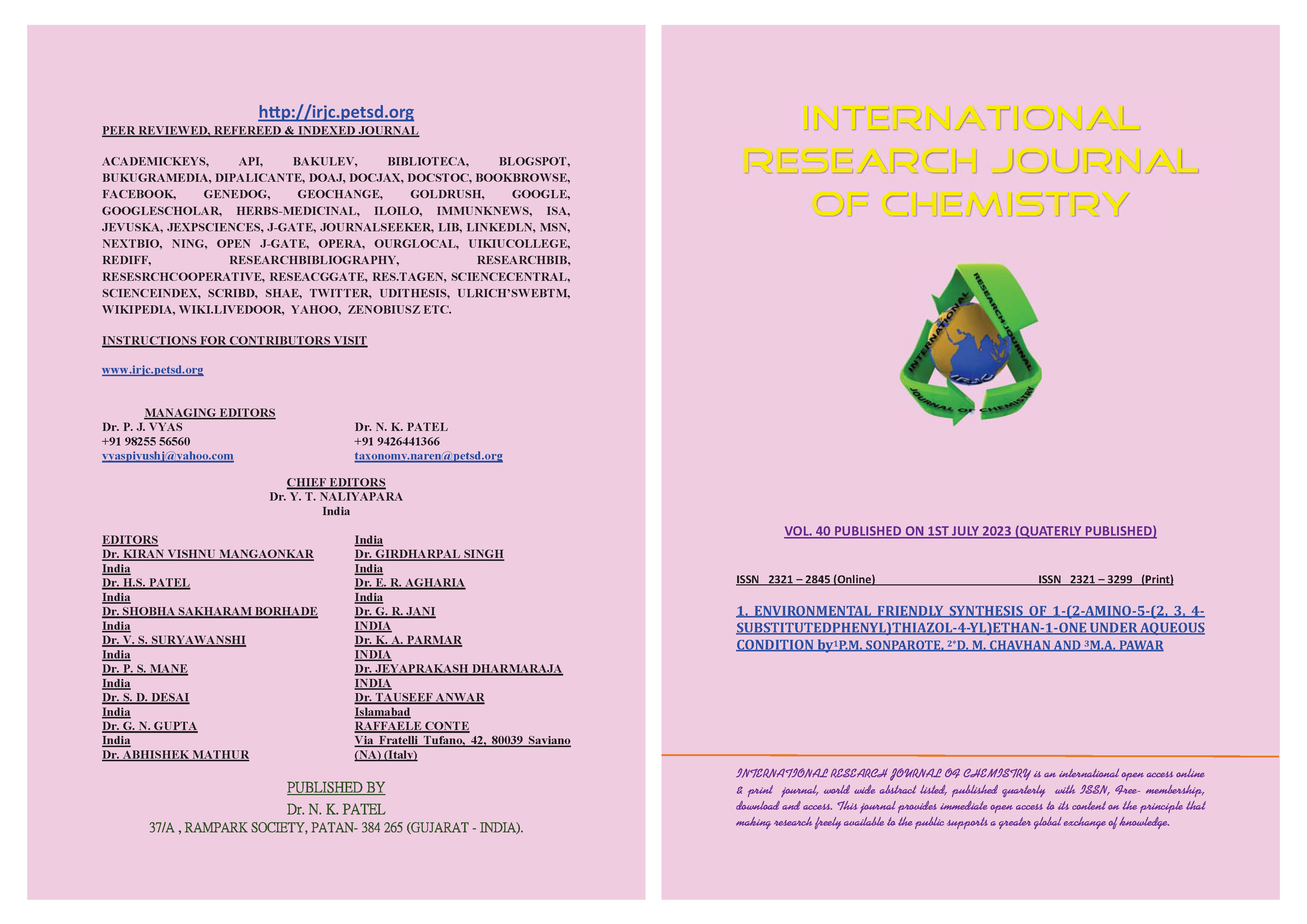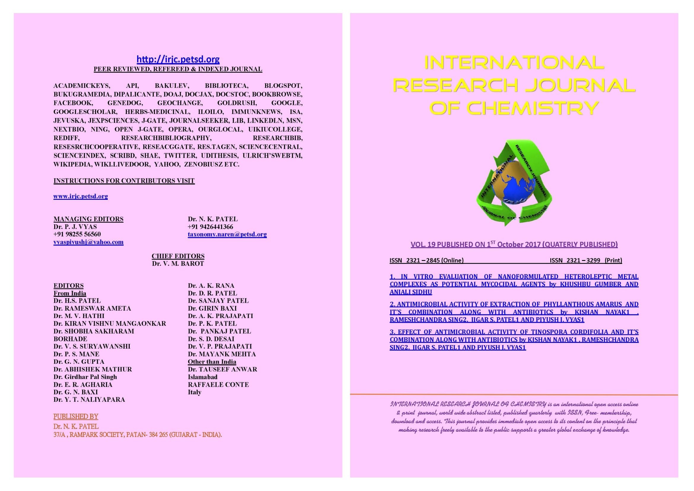 CHIEF EDITORS Prin. Dr. P. J. VYAS +91 98255 56560 Dr. Rita K. Rai EDITORS From India Dr. H.S. PATEL Dr. RAMESWAR AMETA Dr. M. V. HATHI Dr. KIRAN VISHNU MANGAONKAR Dr. SHOBHA SAKHARAM BORHADE Dr. GAURANG JANI Dr. V. S. SURYAWANSHI Dr. P. S. MANE Dr. G. N. GUPTA Dr. ABHISHEK MATHUR Dr. Girdhar Pal Singh Dr. E. R. AGHARIA Dr. G. N. BAXI Dr. Y. T. NALIYAPARA Dr. A. K. RANA Dr. D. R. PATEL Dr. SANJAY PATEL Dr. GIRIN BAXI Dr. A. K. PRAJAPATI Dr. P. K. PATEL Dr. PANKAJ PATEL Dr. S. D. DESAI Dr. MAYANK MEHTA Other Than India Dr. TAUSEEF ANWAR Islamabad RAFFAELE CONTE Italy |